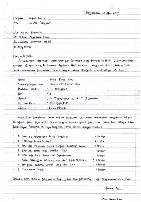 Berbeda dengan surat lamaran kerja yang ditulis tangan yang secara tidak langsung dapat menggambarkan kepribadian anda melalui tulisan anda. Selain itu, lamaran yang ditulis dapat menarik perhatian perusahaan untuk membacanya. Berikut adalah contoh isi surat lamaran kerja tulis tangan: Manfaat menulis surat lamaran kerja ini antara. Pengertian surat lamaran kerja adalah surat permohonan yang dikirimkan oleh pencari kerja kepada badan usaha atau instansi untuk mendapatkan pekerjaan atau jabatan sesuai dengan posisi yang untuk itu, anda pun bisa menggunakan contoh surat lamaran kerja tulis tangan di bawah ini. Dengan hormat, bersama surat lamaran ini, saya bermaksud untuk mengajukan permohonan kerja di pt titikdua network pada posisi teknisi komputer. Arta gemilang motor jalan sejahtera no.31 namun jika diperhatikan secara lebih mendalam, contoh surat lamaran kerja tulis tangan ini. Contoh surat lamaran kerja restoran tulis tangan.